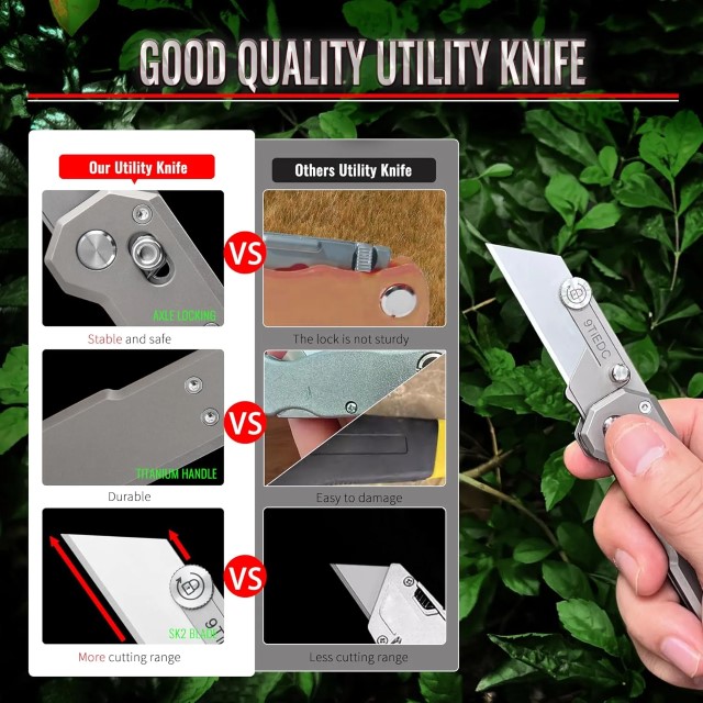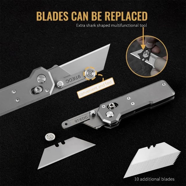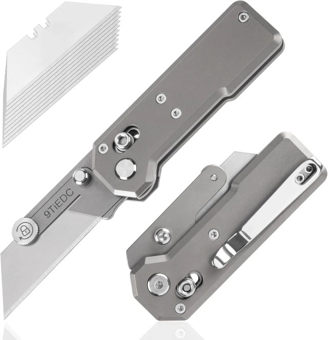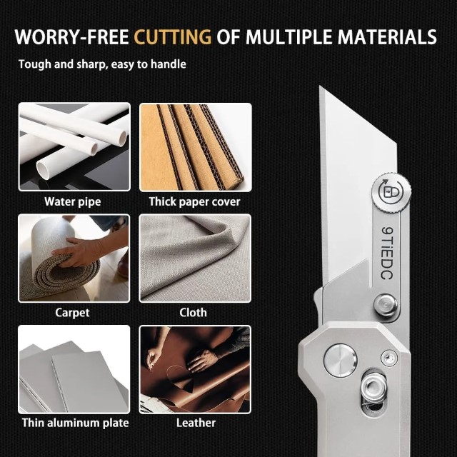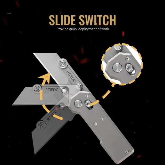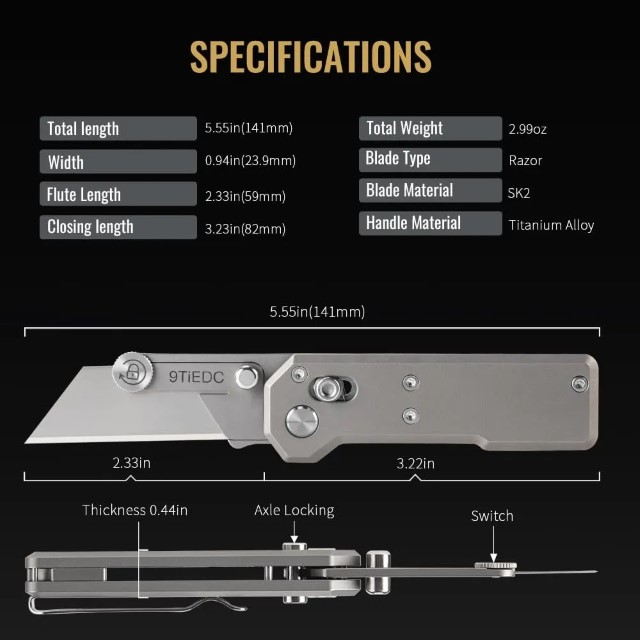Dụng cụ rọc giấy 9Ti EDC với chất liệu cán titaniun kích cỡ nhỏ gọn trong lòng bàn tay, sử dụng lưỡi dao mini thép không rỉ dễ dàng thay thế và mài lại. Dễ dàng đóng mở một tay với cơ chế bấm trượt, khi không sử dụng bạn chỉ cần vặn chặt ốc là lưỡi dao sẽ bị khóa lại tránh việc bị mở tuột lưỡi ngoài ý muốn.