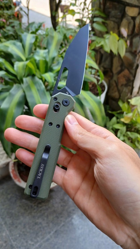 Lưỡi dao cao cấp: Dao gấp TACRAY Tarcus có lưỡi dao thép D2 3,5 inch với lớp phủ DLC màu đen, mang lại khả năng giữ lưỡi, độ bền và khả năng chống ăn mòn vượt trội. Lưỡi dao hiệu suất cao hoàn hảo cho nhiều mục đích cắt khác nhau, là người bạn đồng hành lý tưởng cho các chuyến phiêu lưu ngoài trời, công việc và sử dụng hàng ngày.