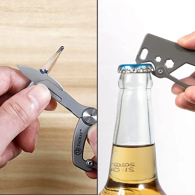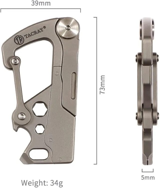 Tacray Carabiner V2 là phiên bản nâng cấp toàn diện từ thế hệ trước, với thiết kế lớn hơn, lưỡi dao cải tiến và đặc biệt là phần lẫy khóa được tinh chỉnh cho độ đàn hồi và chắc chắn vượt trội. Được gia công từ titanium cao cấp, sản phẩm chỉ nặng 35g nhưng tích hợp hàng loạt chức năng hữu ích như: móc khóa, thước đo cm, tua vít 2 cạnh, mở bia, vặn lục giác 2 cỡ và lưỡi dao mổ số 22. Với kích thước 72x40x4mm, đây là món phụ kiện hoàn hảo cho những ai yêu thích sự gọn gàng, bền bỉ và đa năng trong từng chi tiết.